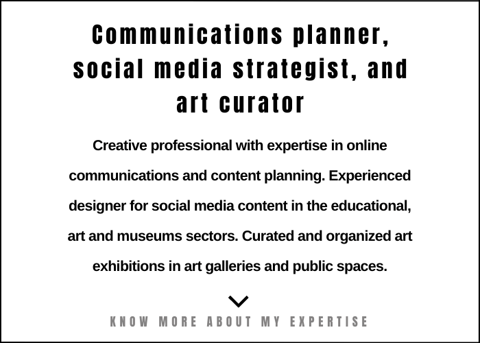 My passion for communication and design is at the core of my work. My two-year collaboration with GradProSkills (2019-2021) as a communications assistant and social media coordinator shows my work as a blog writer, social media planner, graphic designer, photographer, and video editor. I have more than five years of experience as a business entrepreneur running the creative side of my online art gallery.